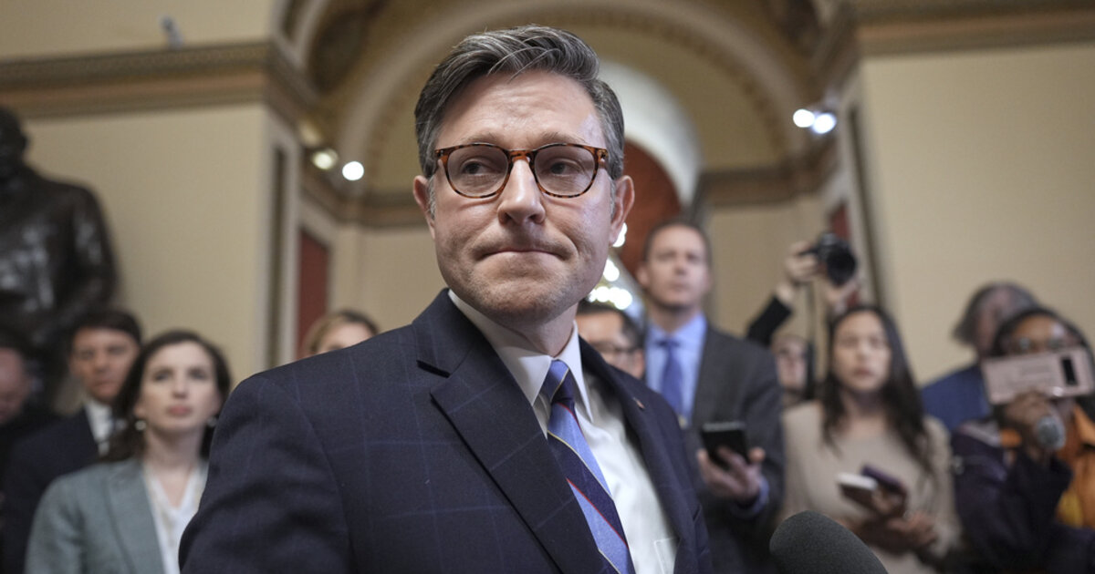 FILE - Speaker of the House Mike Johnson, R-La., talks to reporters just after House Republicans narrowly approved their budget framework, at the Capitol in Washington, April 10, 2025. (AP Photo/J. Scott Applewhite, File)