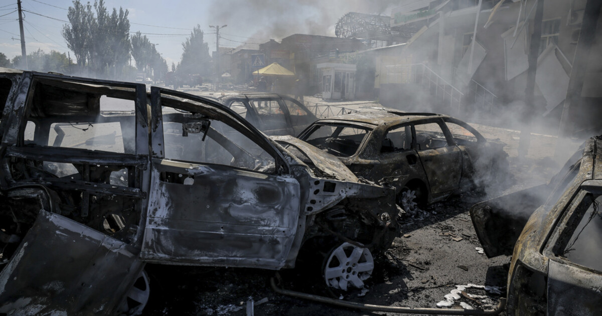 In this photo provided by Ukraine's 24th Mechanized Brigade press service, smoke rises after a Russian drone hit the market in the town of Druzhkivka, Donetsk region, Ukraine, Saturday, Aug. 2, 2025, (Oleg Petrasiuk/Ukraine's 24th Mechanized Brigade via AP)
