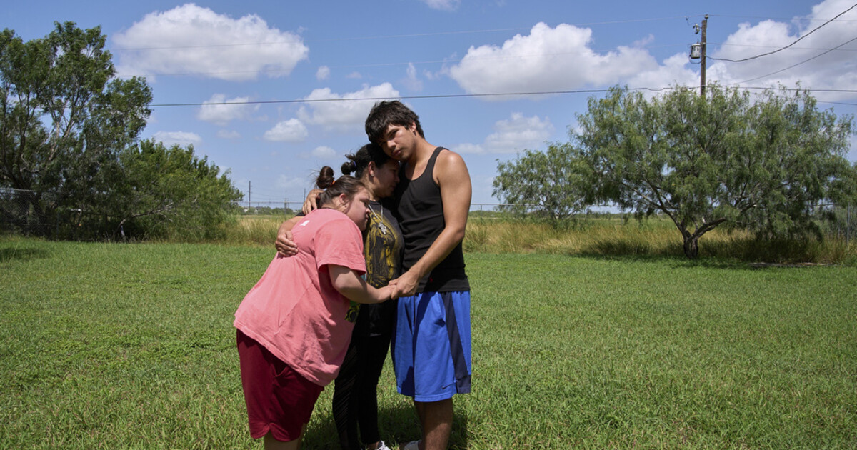 Juanita is hugged by her children, Jose, 15, and daughter Marely, 17, who has Down syndrome, Tuesday, June 17, 2025, during a portrait in Hidalgo County, Texas. (AP Photo/Jacquelyn Martin)