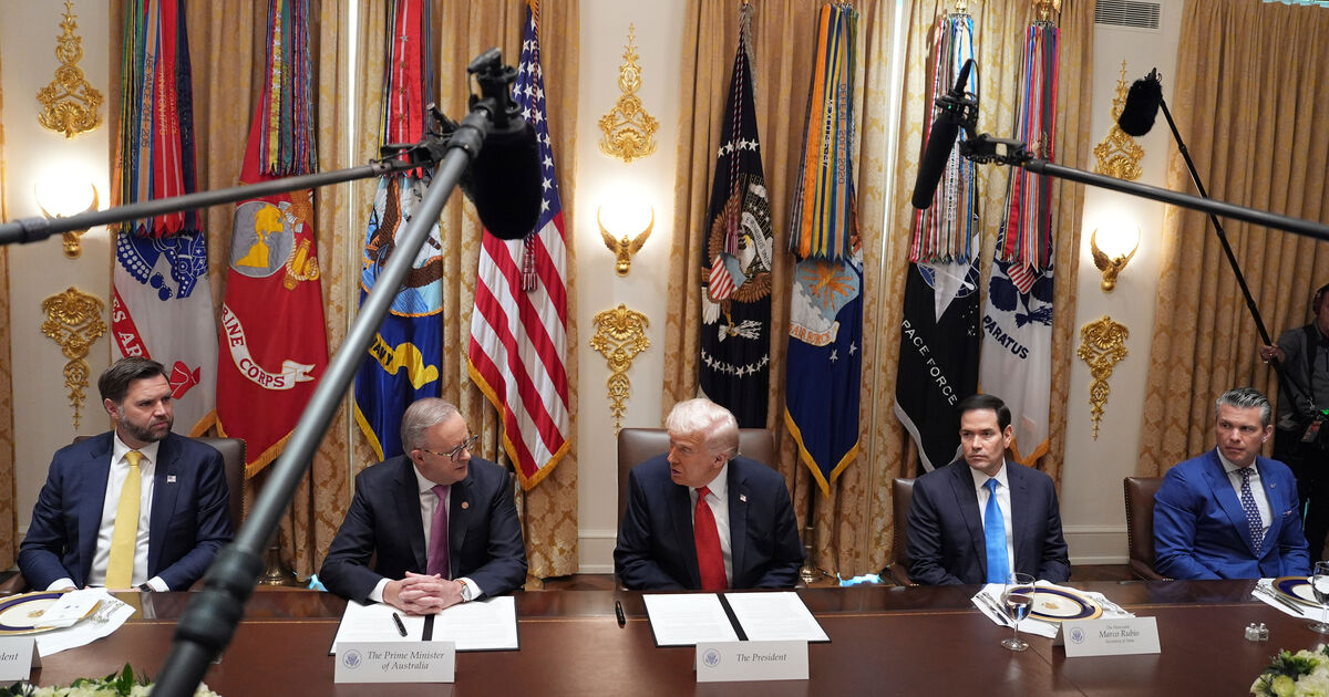 Caption: President Donald Trump, center, meets with Australian Prime Minister Anthony Albanese, second left, as Vice President JD Vance, from left, Secretary of State Marco Rubio and Defense Secretary Pete Hegseth, right, listen, in the Cabinet Room of the White House, Friday, Oct. 20, 2025, in Washington. (AP Photo/Evan Vucci)