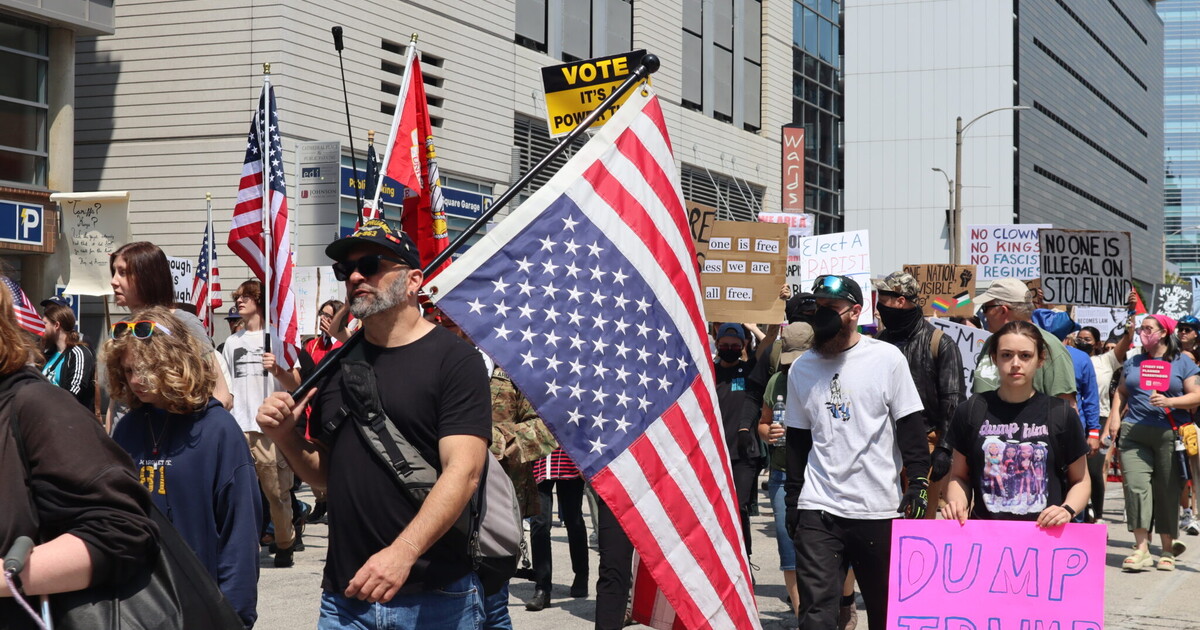 Protesters gather in Milwaukee’s Cathedral Square to march and rally as part of the No Kings Day protests nationwide. (Photo by Isiah Holmes/Wisconsin Examiner)