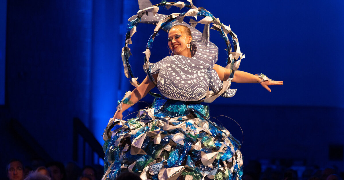 “I did a lot of research on what schooling is, specifically strength in numbers with predators and studying the ways that bait balls are formed with predators,” Grimes said. A “bait ball” is a tight protective school of fish, and it provided the inspiration for the shape and design of a hoop skirt formed of colorful, sparkling origami fish, which rotated around Johnson’s waist on a flexible shower curtain track. The skirt took a long time to perfect, Grimes said, and an early version made with wire, netting and pool noodles was too flimsy and had to be scrapped.