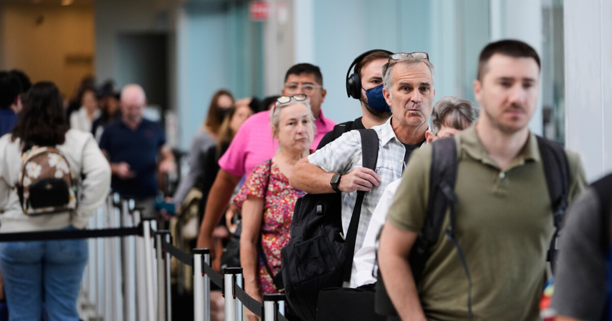 Travelers wait in line for screening at Louis Armstrong New Orleans International Airport in Kenner, La., Wednesday, Oct. 15, 2025. (AP Photo/Gerald Herbert)