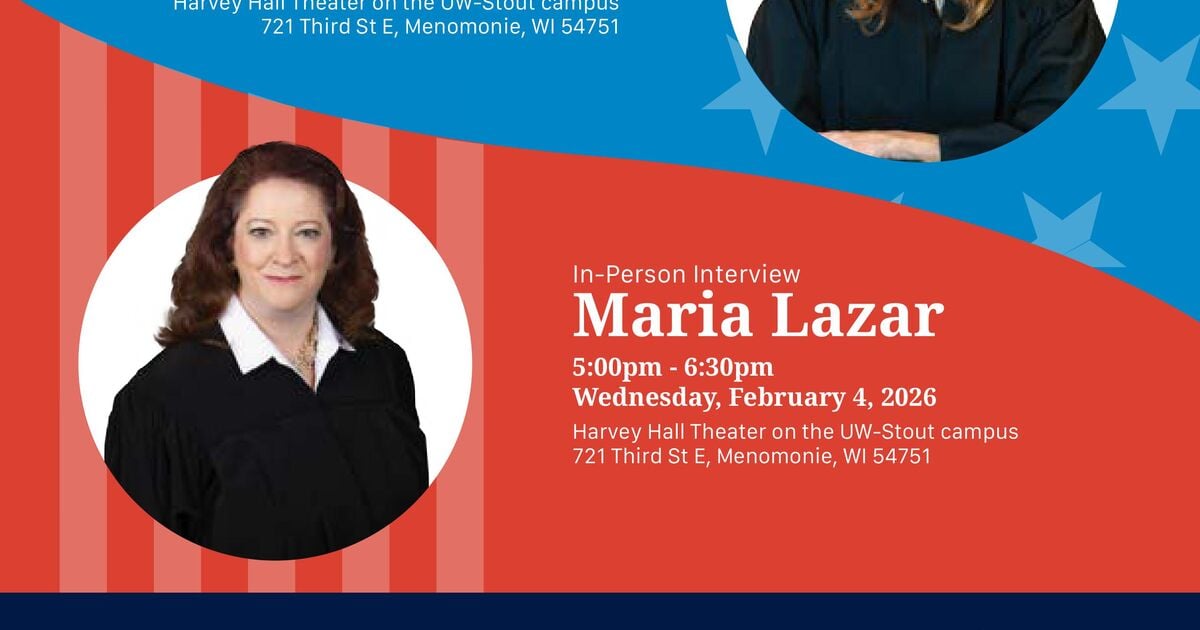 Maria Lazar, Judge of the Court of Appeals, District II, Waukesha, will be available on Wednesday, Feb. 4, 2026, from 5 to 6:30 p.m., at Harvey Hall Theater on the UW-Stout Campus, 721 Third St., E, Menomonie.