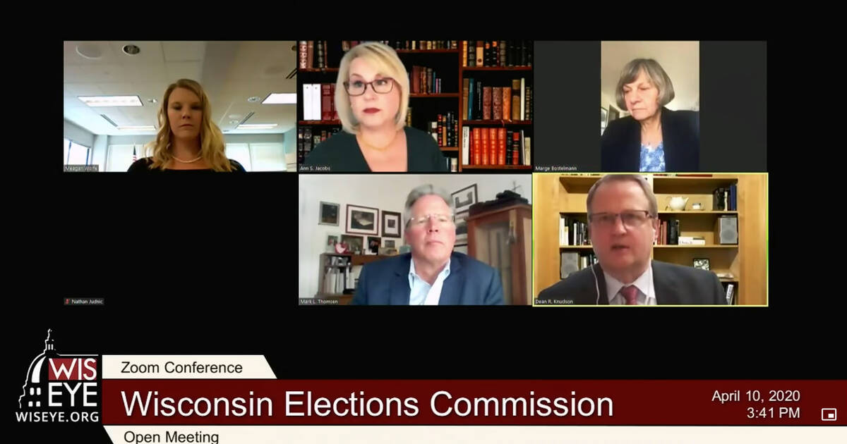 Members of the Wisconsin Elections Commission appear in a teleconference meeting on April 10, 2020. Clockwise from left are Administrator Meagan Wolfe, commissioners Ann Jacobs, Marge Bostelmann, Dean Knudson and Mark Thomsen. Commission member Robert “Bob” Spindell Jr. joined by phone, and commissioner Julie Glancey was off screen. Wisconsin Elections Commission via WisEye